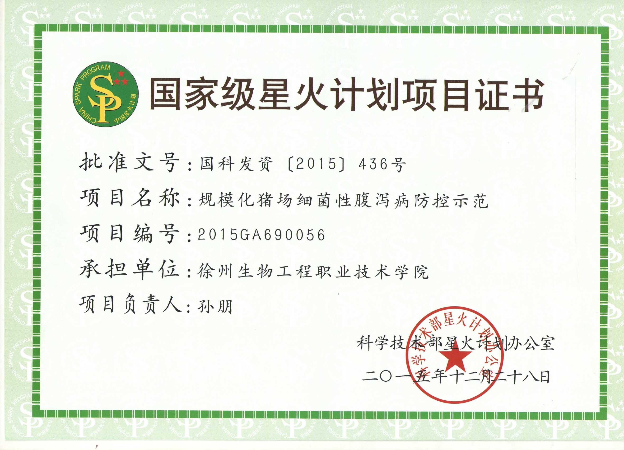 2015年科技部星火计划项目证书-规模化猪场细菌性腹泻病防控示范