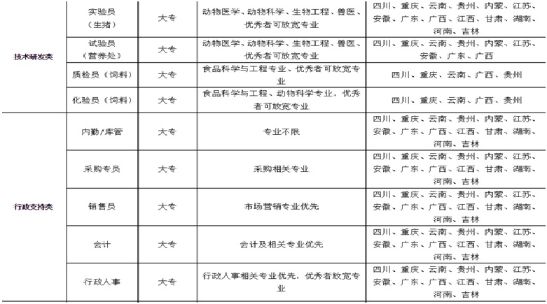(一)技术类目标专业:动物医学、动物科学、生物技术、生物工程、生物科学、动物营养、兽医相关专业、遗传育种,优秀者可放宽专业限制;