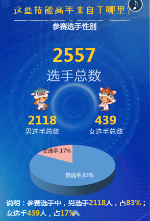 从性别看,各项目参赛选手性别特点鲜明。共有男选手2118名,占比83%;女选手439名,占比17%。焊接、飞机维修、工业控制、砌筑等29个项目全部是男选手,美容项目全部是女选手。另外,健康和社会照护、酒店接待等9个项目女选手占比超过2/3。男女选手占比比较均衡的项目为油漆与装饰、平面设计技术。