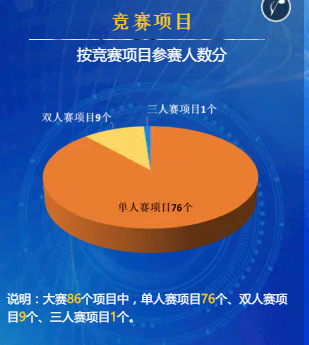 本届大赛共设86个比赛项目,其中,单人赛项目76个、双人赛项目9个、三人赛项1个,是新中国成立以来竞赛项目最多的一次职业技能赛事。