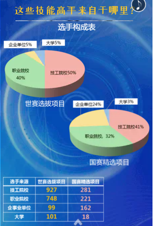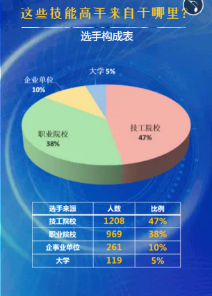 从身份看,由于世赛项目占比高,学生身份的选手比较多。参赛选手中技工院校学生1208名,占比47%;大中专院校学生1088名,占比43%;企业职工261名,占比10%。海南省技师学院、江西省电子信息技师学院、江苏省常州技师学院、广东省机械技师学院、广州市工贸技师学院等23所技工院校,长春职业技术学院、重庆电子工程职业学院等7所职业院校的参赛选手都超过10名。