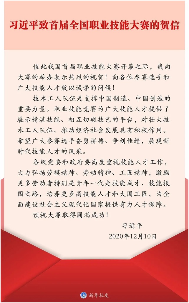 12月10日,中华人民共和国第一届职业技能大赛在广东省广州市开幕。中共中央总书记、国家主席、中央军委主席习近平发来贺信,向大赛的举办表示热烈的祝贺,向参赛选手和广大技能人才致以诚挚的问候。