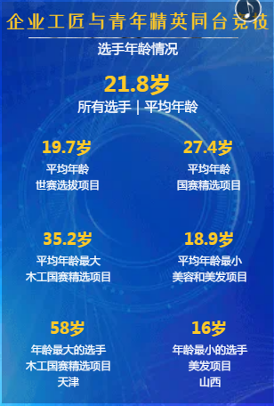 从年龄看,由于世赛选拔项目对年龄有限制,年轻选手多。全部选手平均年龄21.8岁,最大的58岁,最小的16岁,30岁以下的占90%。其中世赛选拔项目平均年龄19.7岁,国赛精选项目平均年龄27.4岁。选手平均年龄最大的项目是木工国赛精选项目,平均年龄35.2岁;年龄最小的项目是美容项目和美发项目,平均年龄均为18.9岁。