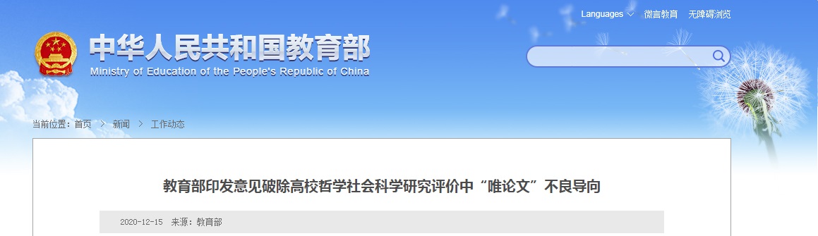 教育部印发《关于破除高校哲学社会科学研究评价中“唯论文”不良导向的若干意见》的通知