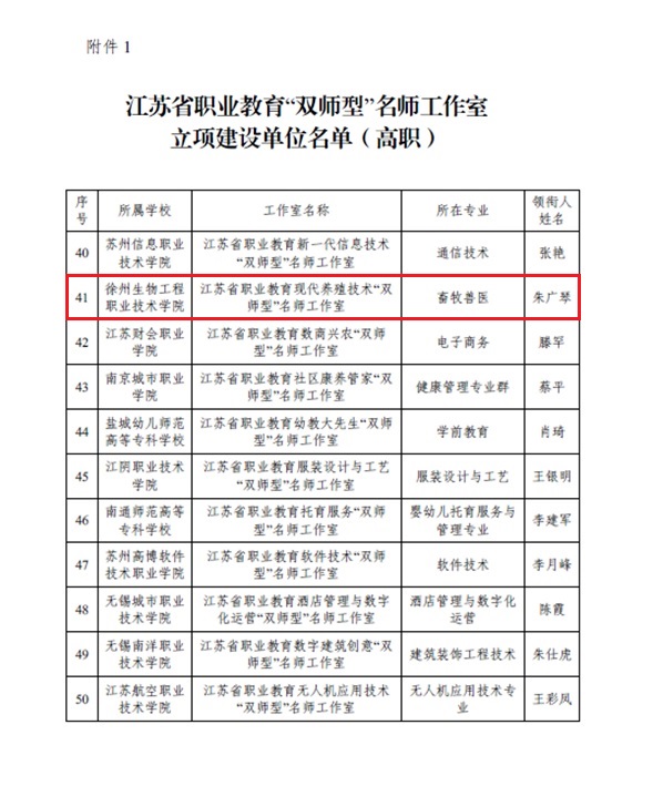 2022年8月2日,江苏省教育厅关于公布首批江苏省职业教育“双师型”名师工作室和技艺技能传承创新平台建设单位名单的通知公布,我校动物工程学院朱广琴教授领衔的“江苏省职业教育现代养殖技术‘双师型’名师工作室”被成功立项建设,获批建设经费30万元。