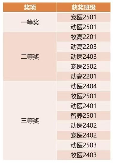 经过激烈的角逐,以下班级团脱颖而出,分获一、二、三等奖,其中宠医2501、动医2501两个班级凭借出色的表现,将代表学院进入校赛。