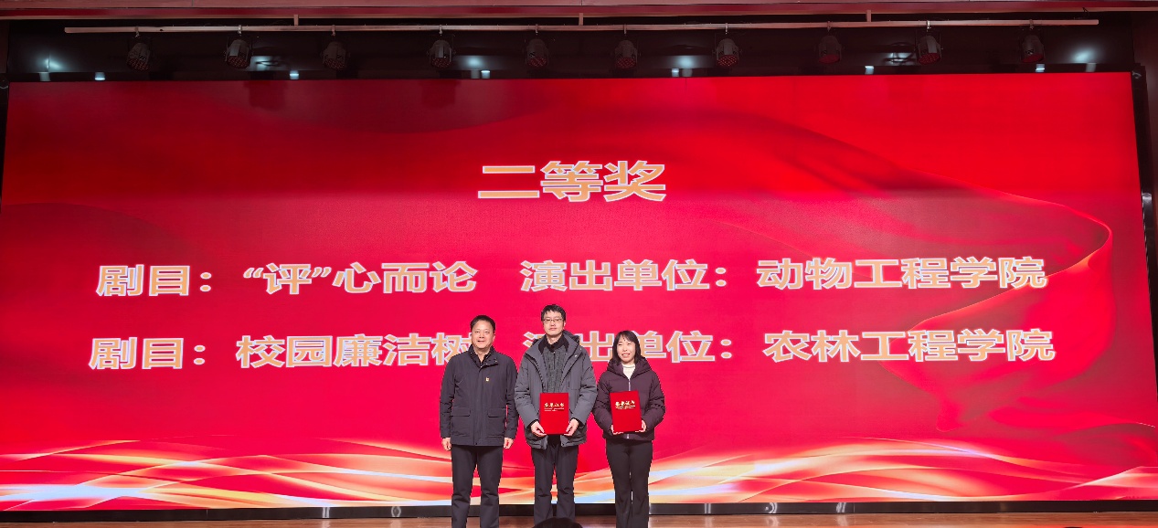 2026年1月7日,徐州生物工程职业技术学院“清风润园 廉洁育人”廉洁文化情景剧评比活动在图书馆副楼三楼报告厅成功举办。我院推选的牧医2501班《“评”心而论》、动医2503班《一场权力梦》两部情景剧作品参赛,其中《一场权力梦》以细腻生活化的表演获观众认可,《“评”心而论》则凭借精巧剧本与精湛演绎脱颖而出,荣获综合二等奖。